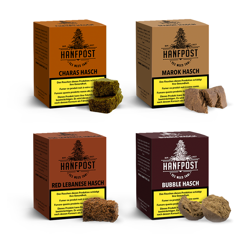 Mit viel Liebe in der Schweiz gepflanzt, gepflückt und verarbeitet. Das Hanfpost Vorteilsset – Charas, Marok, Red Lebanese, Bubble Hasch überzeugt mit seiner Leichtigkeit sowie einer top Qualität und natürlich dem Preis.